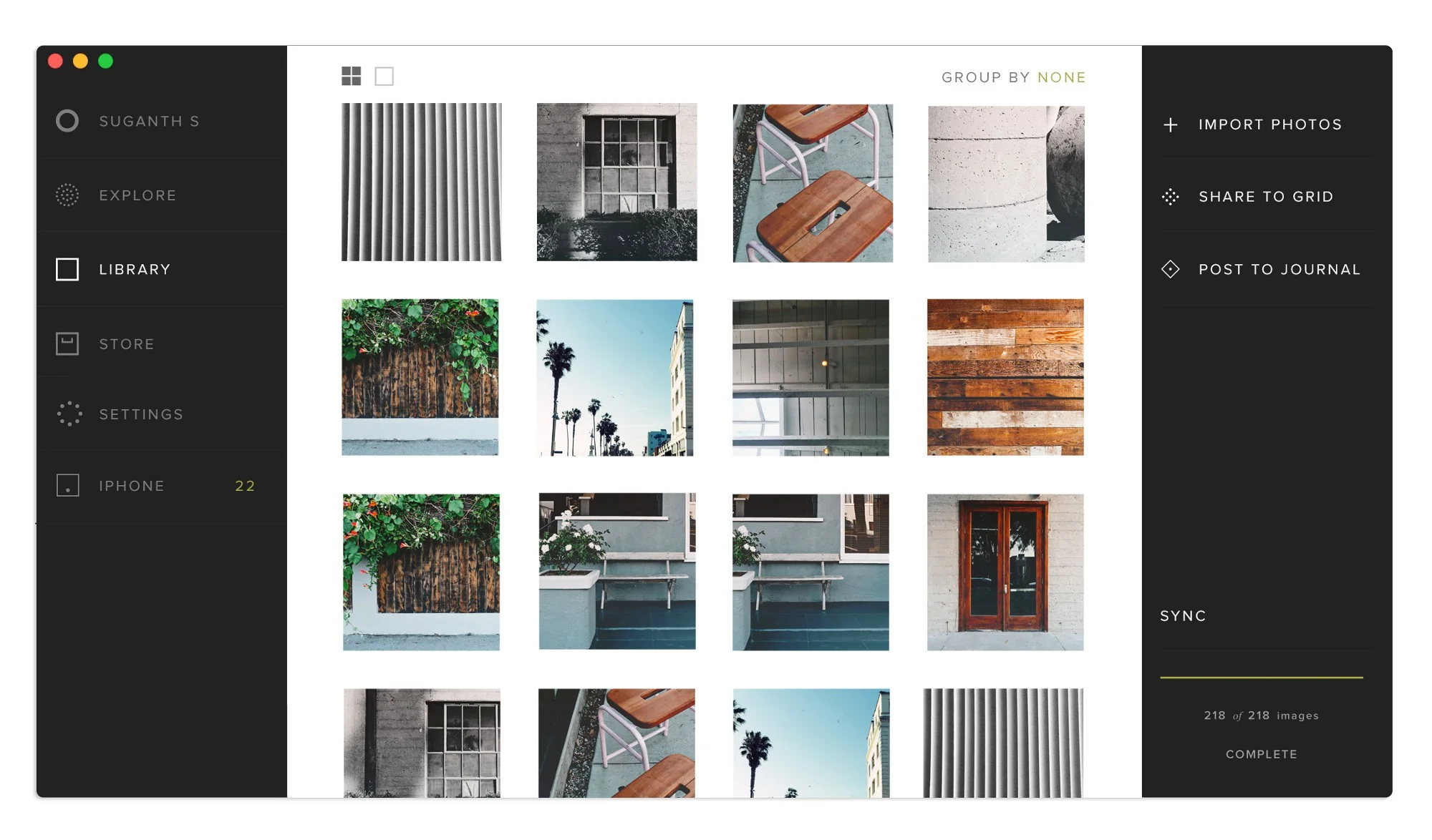 Your synced photos appear here. The library also allows you to import photos from your computer. From here its easy to share to grid, make journals out of your photos. Double clicking on any photo opens photo in edit mode. Single click on a photo will select it and will show options to share, delete, and more
