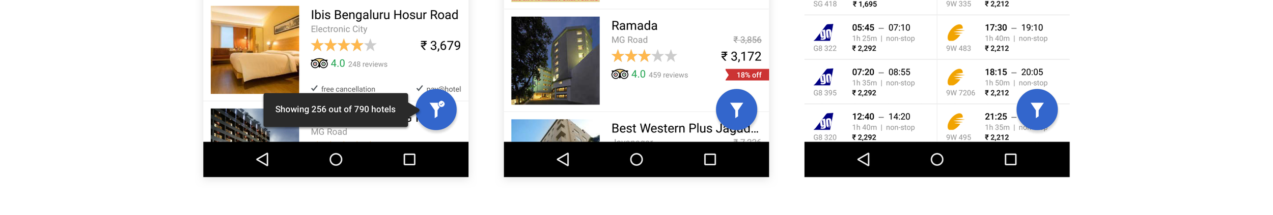 Floating Action Button: We knew that this is one of the buttons google tested well with their users and we immediately felt that we could bring in some important action for the page here. We decided to move our filters action here and give access to contextual filters for different products