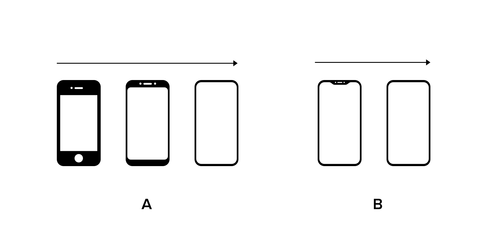 Instead of small iterations towards the end goal, as shown below (A), Apple took the other approach (B). While approach (A) looks prettier, it doesn't move towards its vision as fast compared to approach (B). Moving towards vision also means showing value to users / training them to adapt all screen phone.