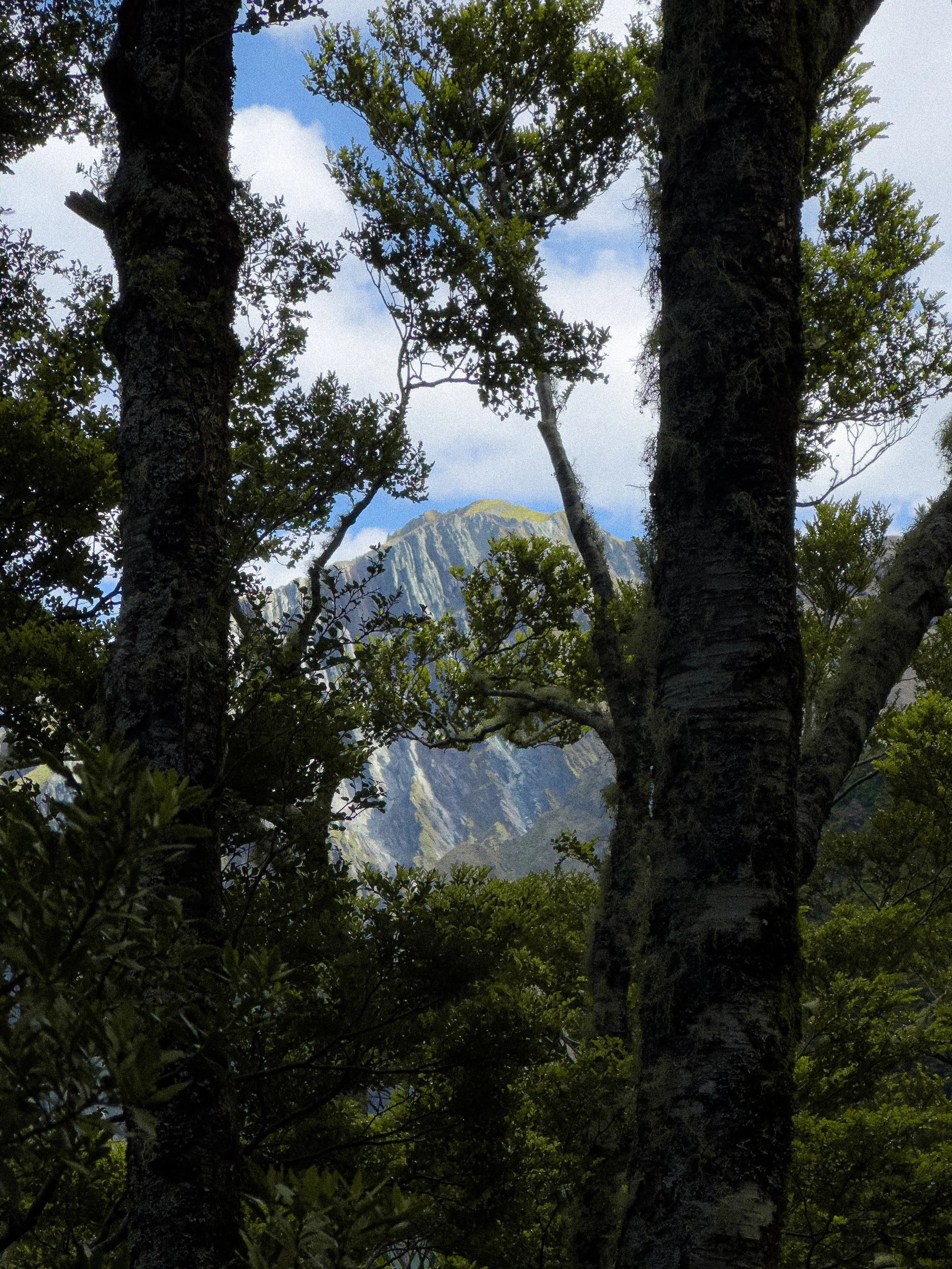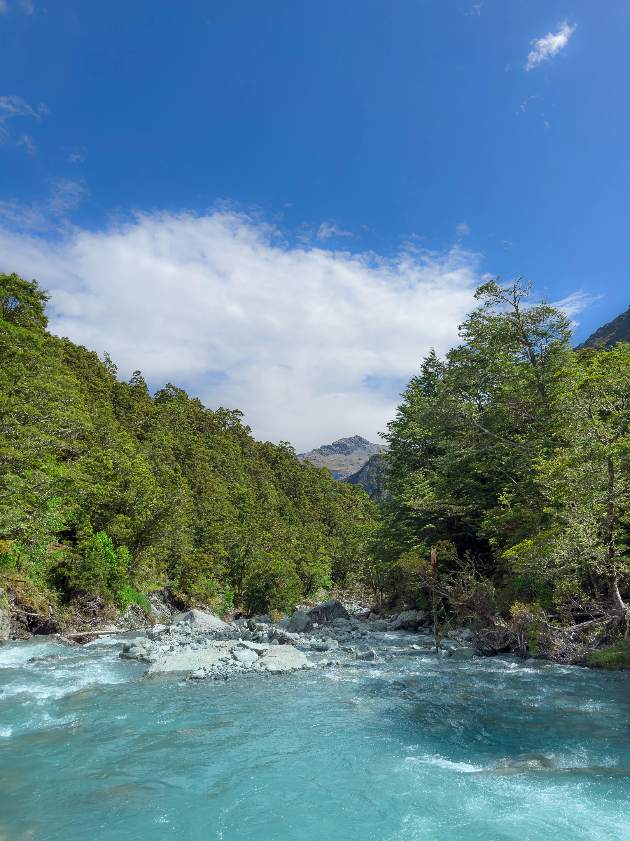 The track was filled with beautiful trees, floating from the edge of the cliff overlooking the turquoise glacier river coming through from the mountains. I love these walks because they show you gracefully how small you are in the existence of time and how long these mountains were around.