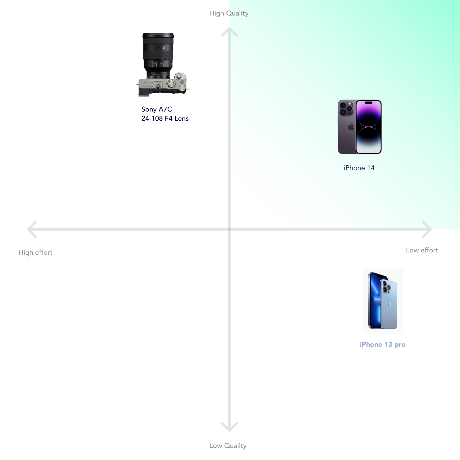 Quality here means how good the photo is — the resolution, details, colour reproduction and most importantly how satisfying the photo is. Effort here means how much effort it is to carry a camera, and how easy it is to capture, edit and post photos.